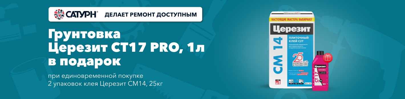 При единовременной покупке 2 упаковок клея ЦЕРЕЗИТ CM14 (25кг), Вы получаете упаковку грунтовки ЦЕРЕЗИТ СТ17 PRO (1л) в подарок!
