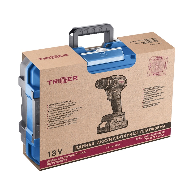 Дрель-шуруповерт Trigger 20121, бесщеточная, 2 аккумулятора Li-ion (2Ач), 18V, 13 мм, 58 Нм, кейс в Самаре