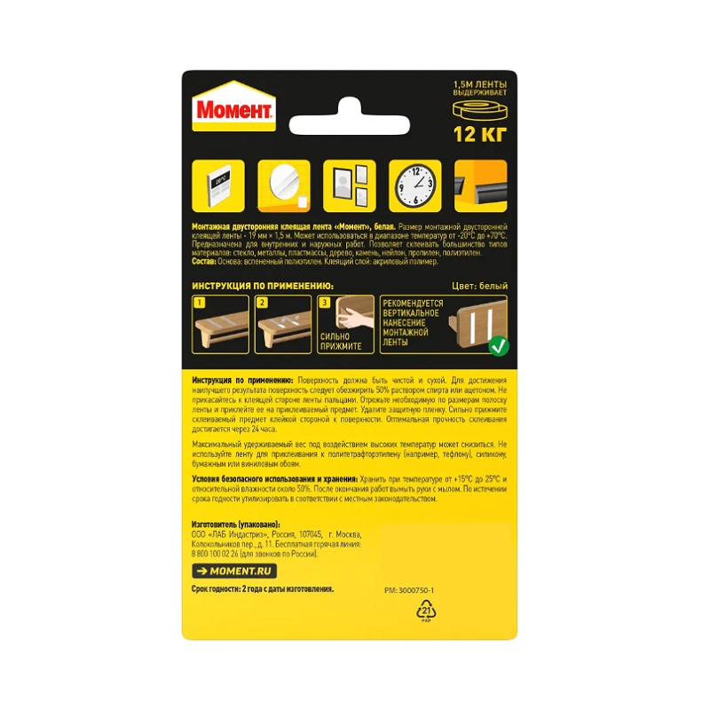 Лента клеящая монтажная двусторонняя Момент,19 мм х 1,5 м