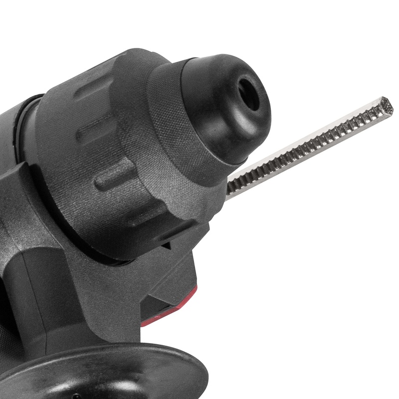 - В комплекте: переходник SDS+, цилиндрический патрон с ключом, дополнительная рукоятка, ограничитель глубины сверления, запасные щетки, пластмассовый кейс