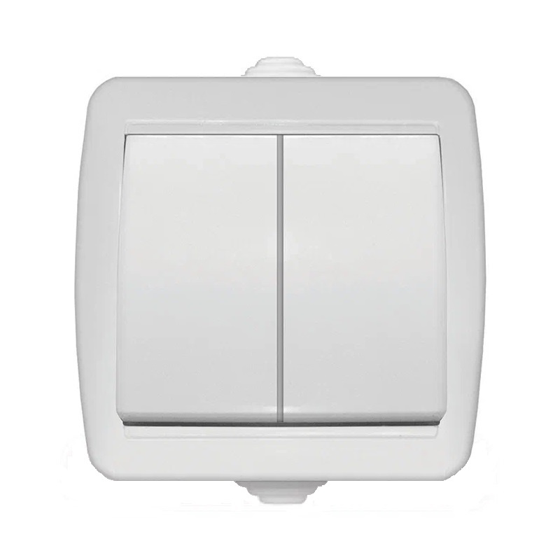 Выключатель Клио К2223, 2 клавиши, б/инд, IP44, белый для открытой установки во влажных помещениях.